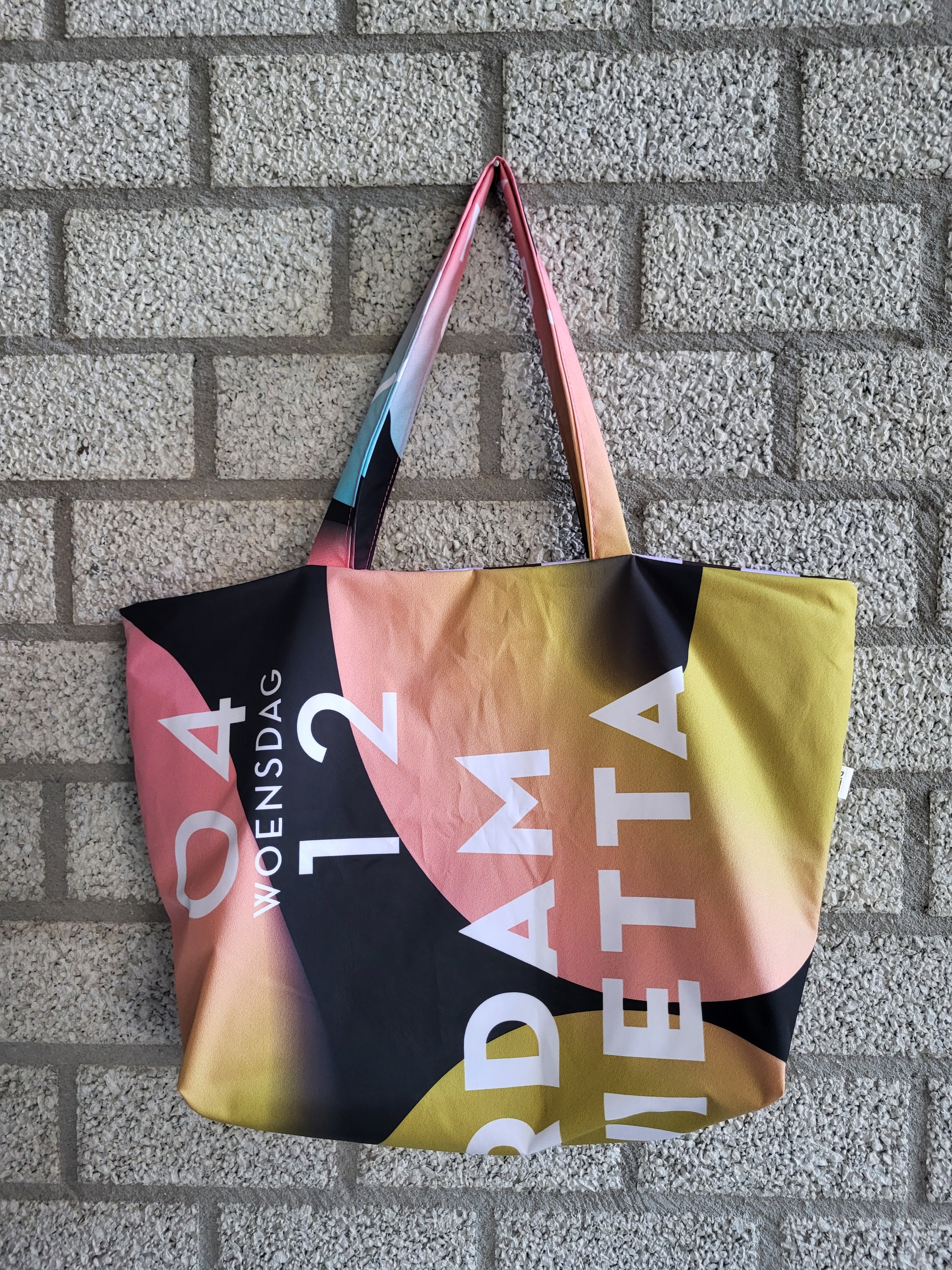 Deze prachtig gekleurde oversized shopper is gemaakt van voormalig promodoek van TivoliVredenburg. Het materiaal is lichtgewicht en heel sterk. De tas is omkeerbaar dus je hebt twee tassen in één! Op de ene kant staat het concert van Amsterdam Sinfonietta en aan de andere kant de neoklassieke avond Unravel.