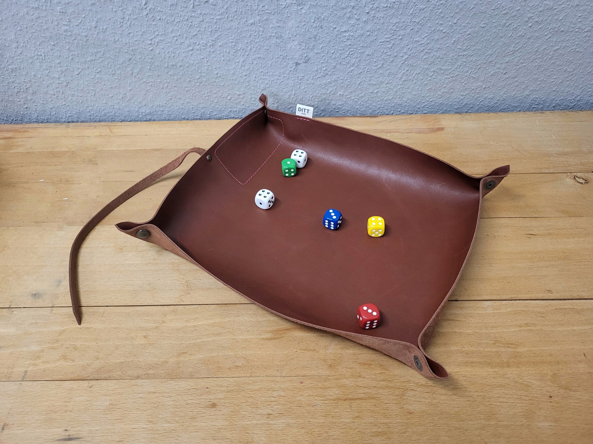 Op een stille camping een spelletje spelen, maar de dobbelstenen maken lawaai op de tafel? Of een spelletje spelen in de trein? Dan is een dobbelmat de oplossing. Je klikt hem tot een bakje en de stenen rollen heel lekker op het leer.