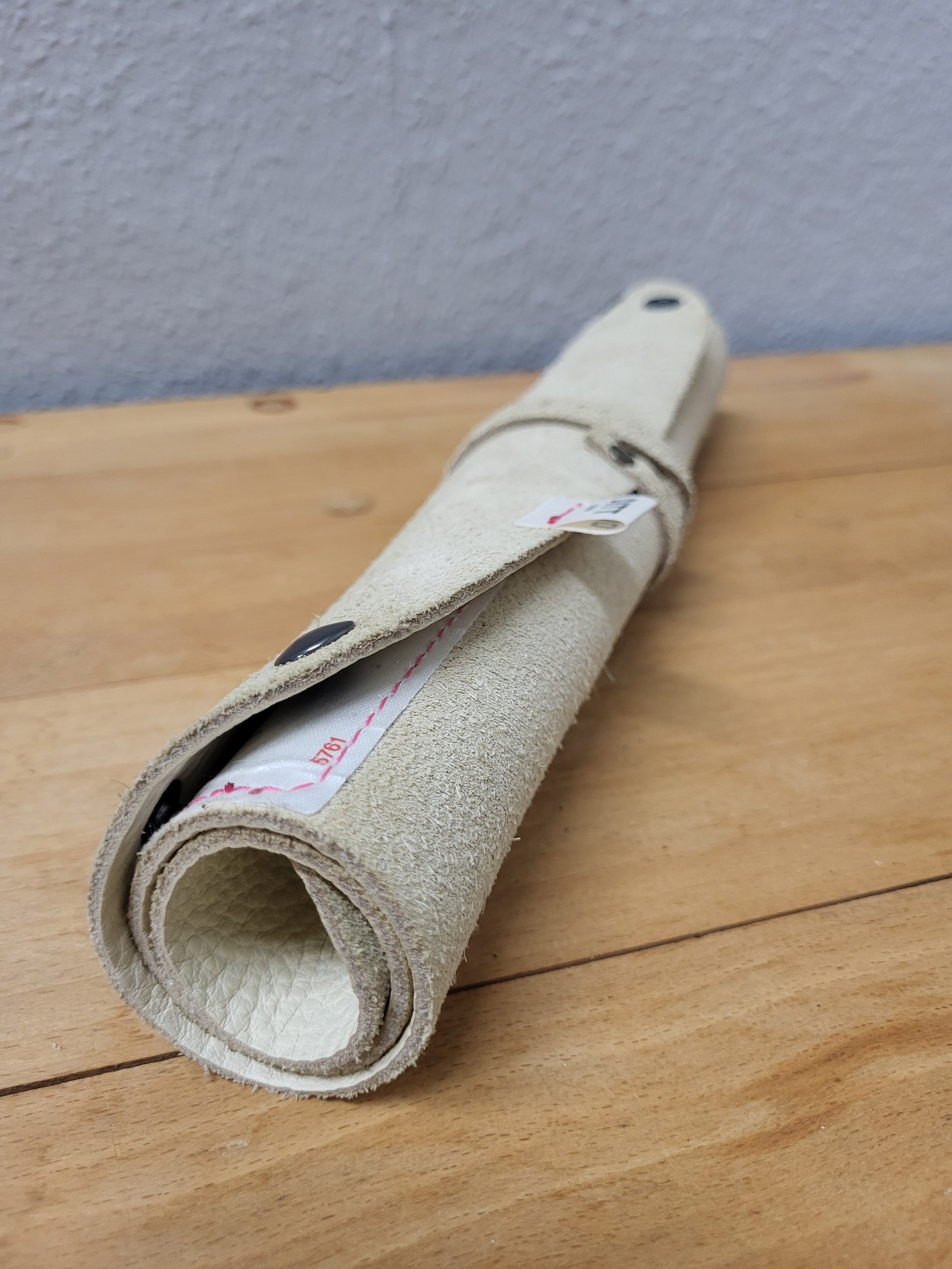 Het leer komt van meubelstalen uit interieurwinkels. Dit is op sommige dobbelmatten nog te zien aan het etiket op de achterkant, dat je precies vertelt wat voor stuk leer het is.