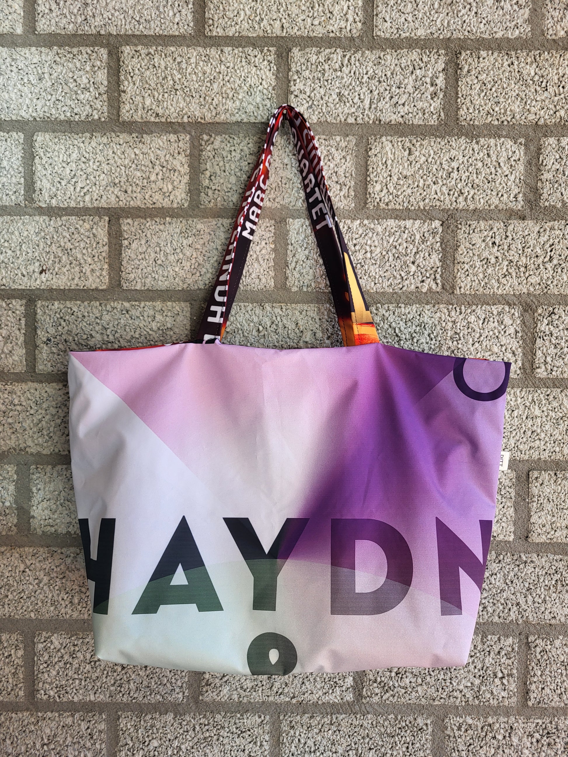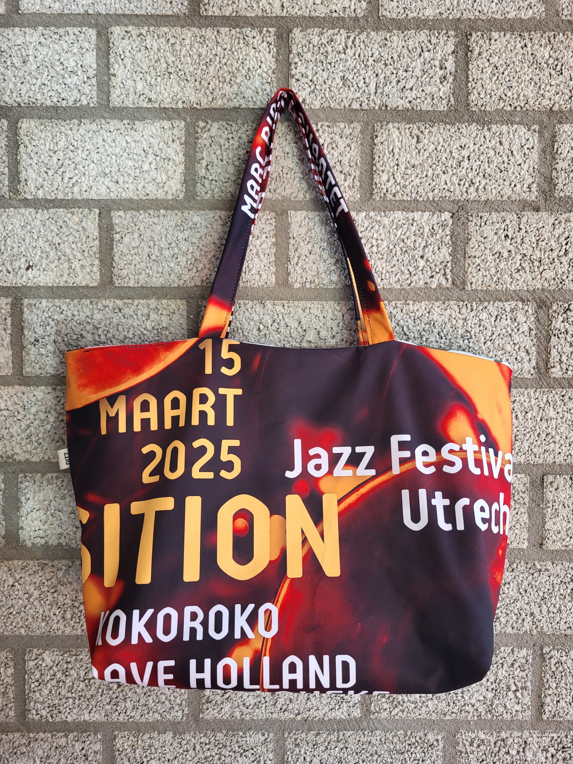 Deze vrolijk gekleurde shopper is gemaakt van voormalig promodoek van TivoliVredenburg. Het materiaal is lichtgewicht en heel sterk. De tas is omkeerbaar dus je hebt twee tassen in één! Op de ene kant staat hét jazzfestival Transition, op de andere kant het concert van het Orkest van de achttiende eeuw met Mozart en Haydn.