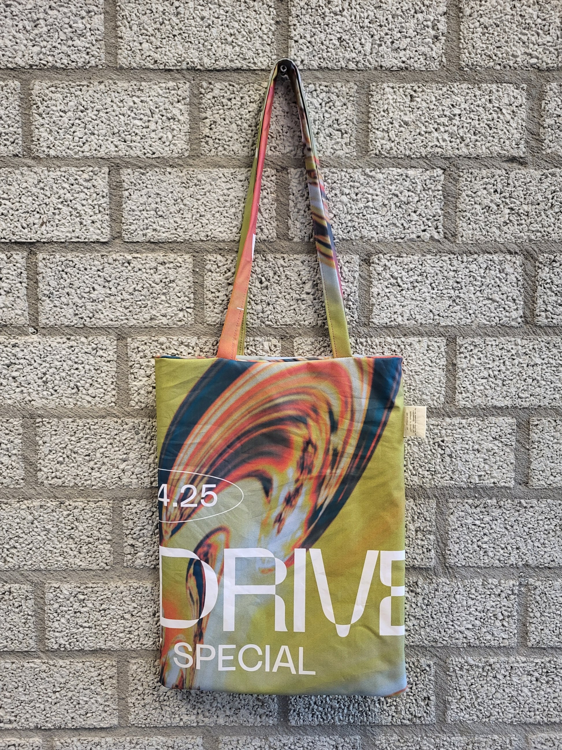 Deze gekleurde shopper is gemaakt van het voormalig promodoek van dansnacht Overdrive in TivoliVredenburg. Het materiaal is lichtgewicht en heel sterk. De tas is omkeerbaar dus je hebt 2 tassen in één! Aan de binnenkant staat de line-up van de avond.